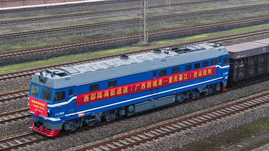 Mit NEVs beladener intermodaler Eisenbahn-Seefrachtzug verlässt Chongqing in China